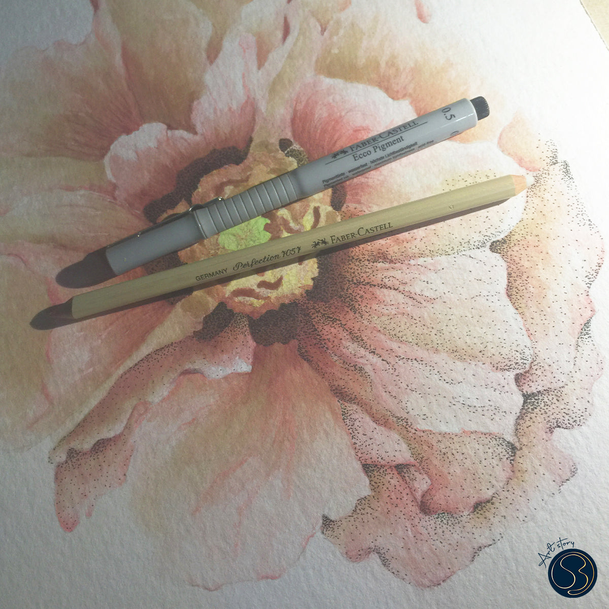 I love combining different media and discover my own techniques. Experimenting brings me lots of joy. Ceramics and jewellery, watercolours and ink pen, colour pencils and watercolours, acrylics and gilding… And much more to try.