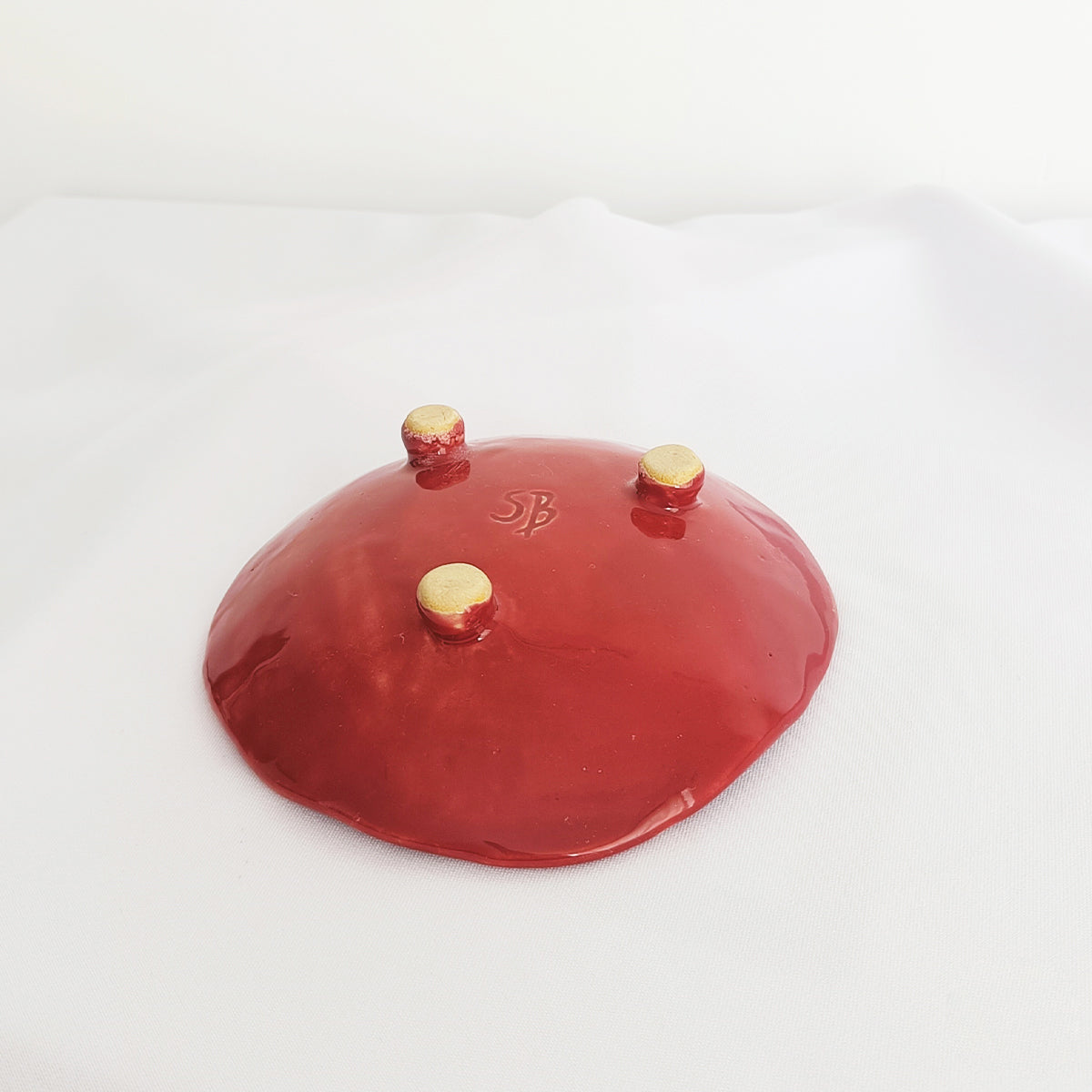 The plate is lovingly made from clay and glazed in a rich carmine color, reminiscent of the hues of a setting sun, evoking feelings of warmth and passion. It stands on three small feet too.
