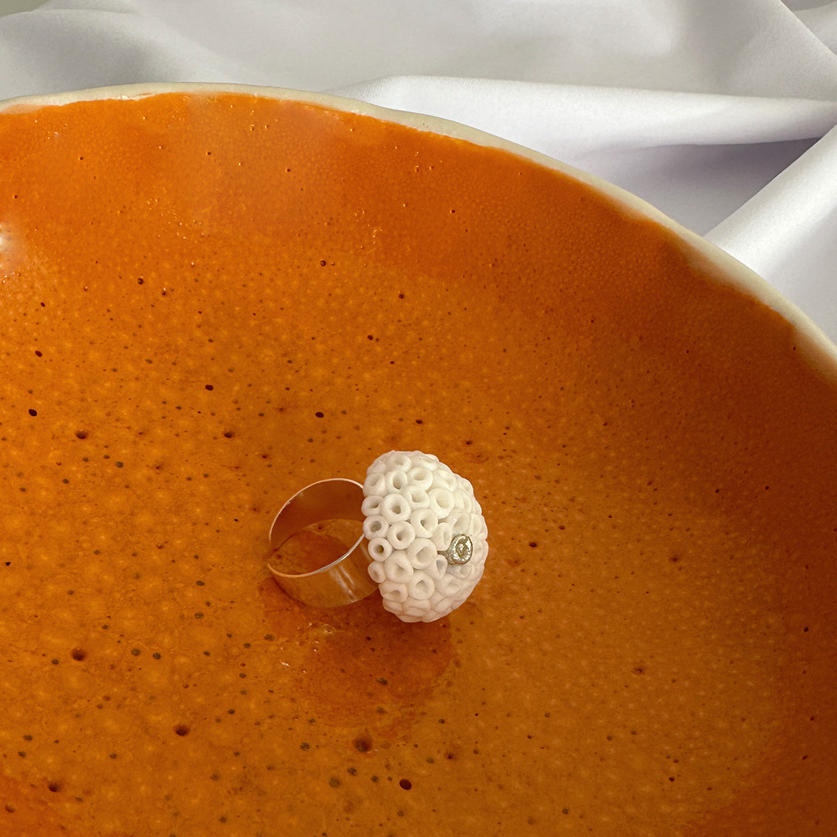 Crafted with precision and artistry, this adjustable ring is a testament to the beauty found in nature's simplest wonders. Resembling a stylized dandelion, its delicate white colour exudes purity and elegance. The meticulous arrangement of tiny tubes on a half sphere creates a mesmerizing texture that captures the essence of a dandelion's ethereal form.